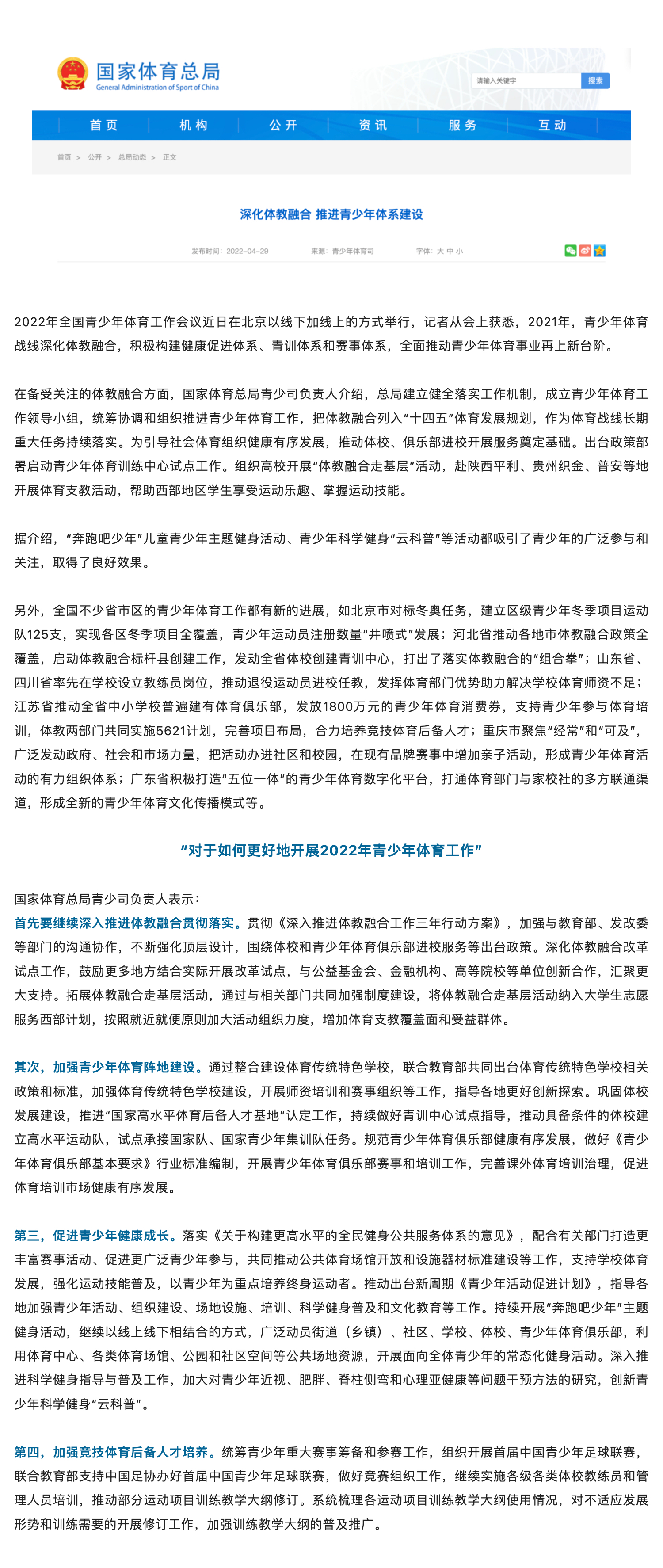 2022年全国青少年体育工作会议:深化体教融合,推进青少年体系建设 来源: 发布时间:2022-10-19 14:10:50 浏览次数: 次 【字体:小 大】 终审:gdysf 点赞 收藏 分享到: 【打印正文】